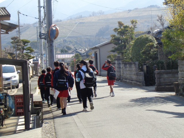 当日は、グループごとに協力しながら計画に沿って行動し、地域に点在する史跡や指定避難場所を一つひとつ確認しました。普段何気なく通っている場所にも歴史的な背景や役割があることに気づき、生徒たちは興味深く学びを深めていました。また、仲間と声を掛け合いながら主体的に行動する姿も多く見られ、充実した活動となりました。
